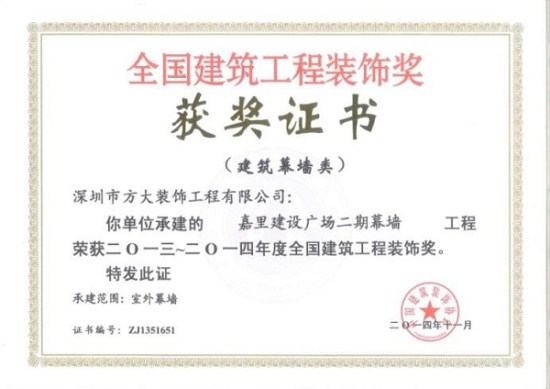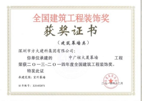 “2013-2014年度天下修建工程装饰奖”获奖效果在北京揭晓,深圳市AG旗舰厅建科集团有限公司荣获四项修建幕墙类大奖,获奖项目划分为:中铁南方总部大厦幕墙工程、大连万达公馆1#楼幕墙工程、嘉里建设广场二期幕墙工程、中广核大厦幕墙工程。