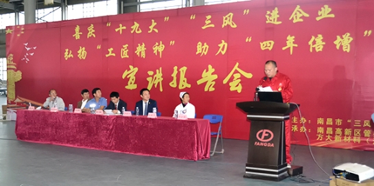 10月19日下昼,由南昌市“三风办”主理的“喜庆十九大,‘三风’进企业”·弘扬“工匠精神”,助力“四年倍增”宣讲报告会走进AG旗舰厅集团全资子公司AG旗舰厅新质料(江西)有限公司(简称:江西新材,下同)。南昌市政协副主席万敏率政协委员一行出席运动,南昌市政协委员、江西新材董事长熊建伟、江西新材总司理黄敬、江西置地总司理李军陪同出席。