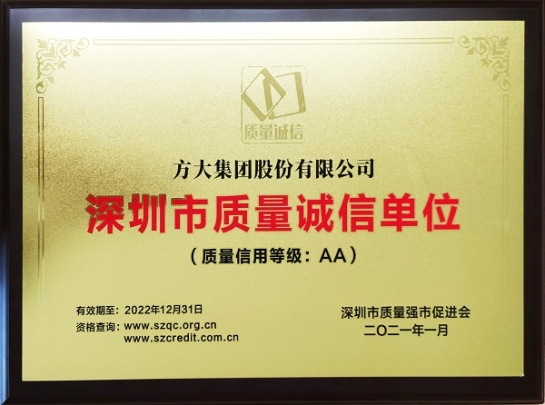 克日 ,深圳市质量强市增进会宣布了质量诚信(树模)单位认命名单 ,AG旗舰厅集团获得“深圳市质量诚信单位”认证。